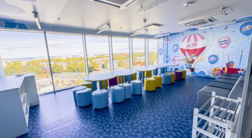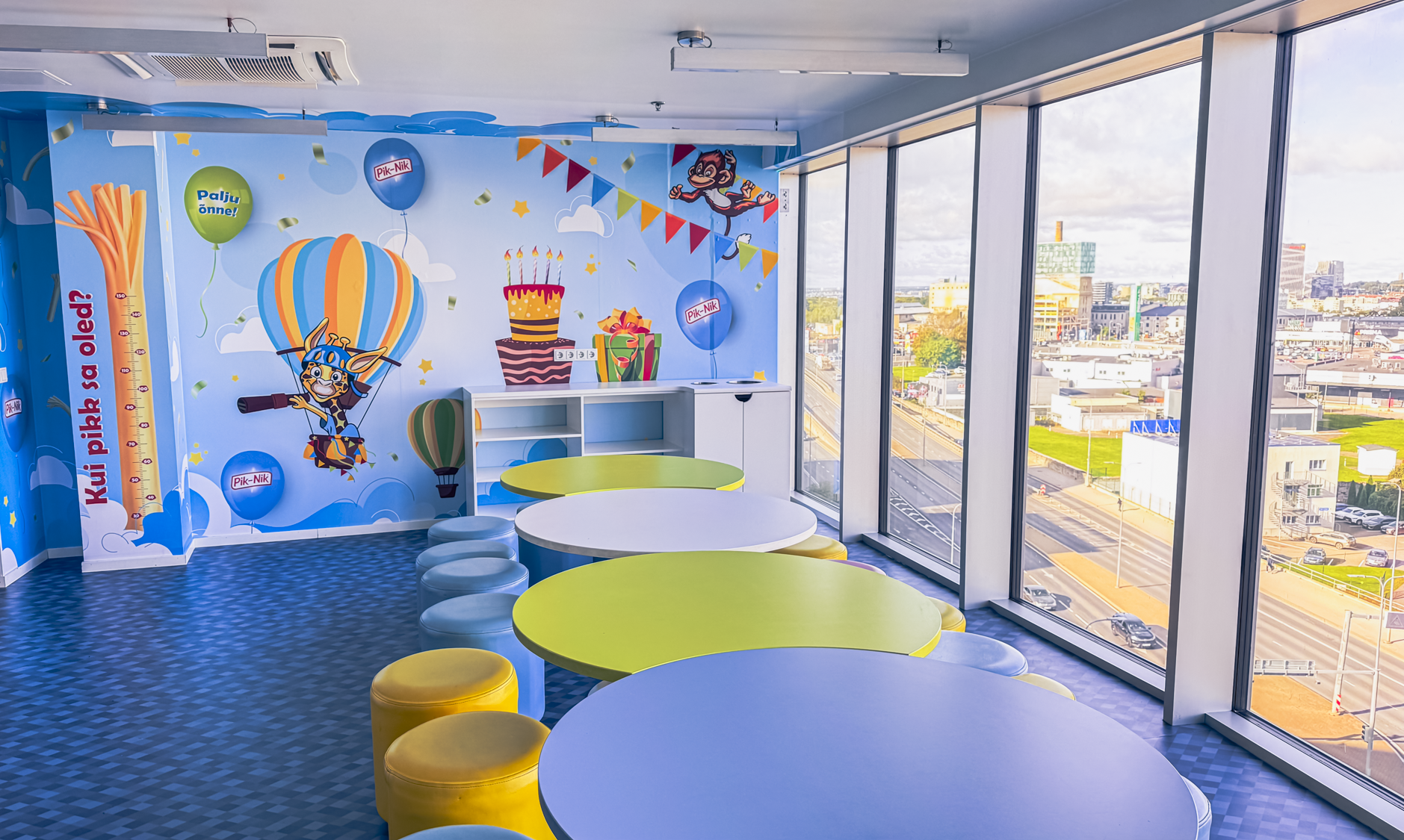 Toas on madalad lauad, mugavad diivanid ja rõõmsavärvilised tumbad. Kohe ümber nurga on abiköök külmkapi, valamute, mikrolaineahju ja veekeetjaga ning seal asuvad peotubades kasutamiseks vajalikud vaasid, kausid, kandikud, tordilabidad ja -noad, morsikannud. Peo kestus 2,5 h. Toa suurus on 23m², mis mahutab mugavalt kuni 30 külalist sh. laste saatjad. |